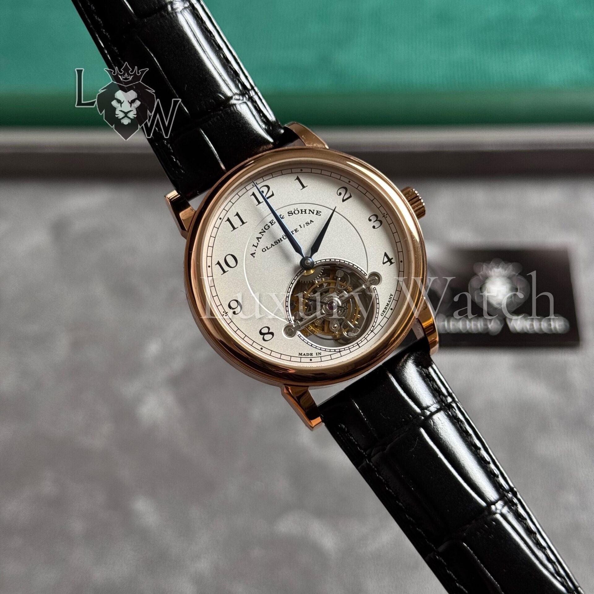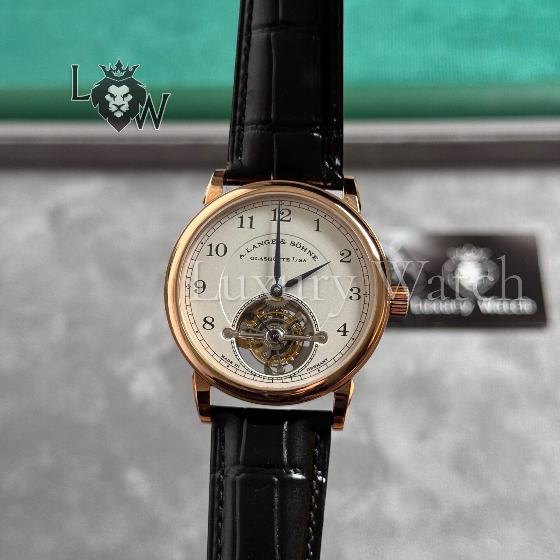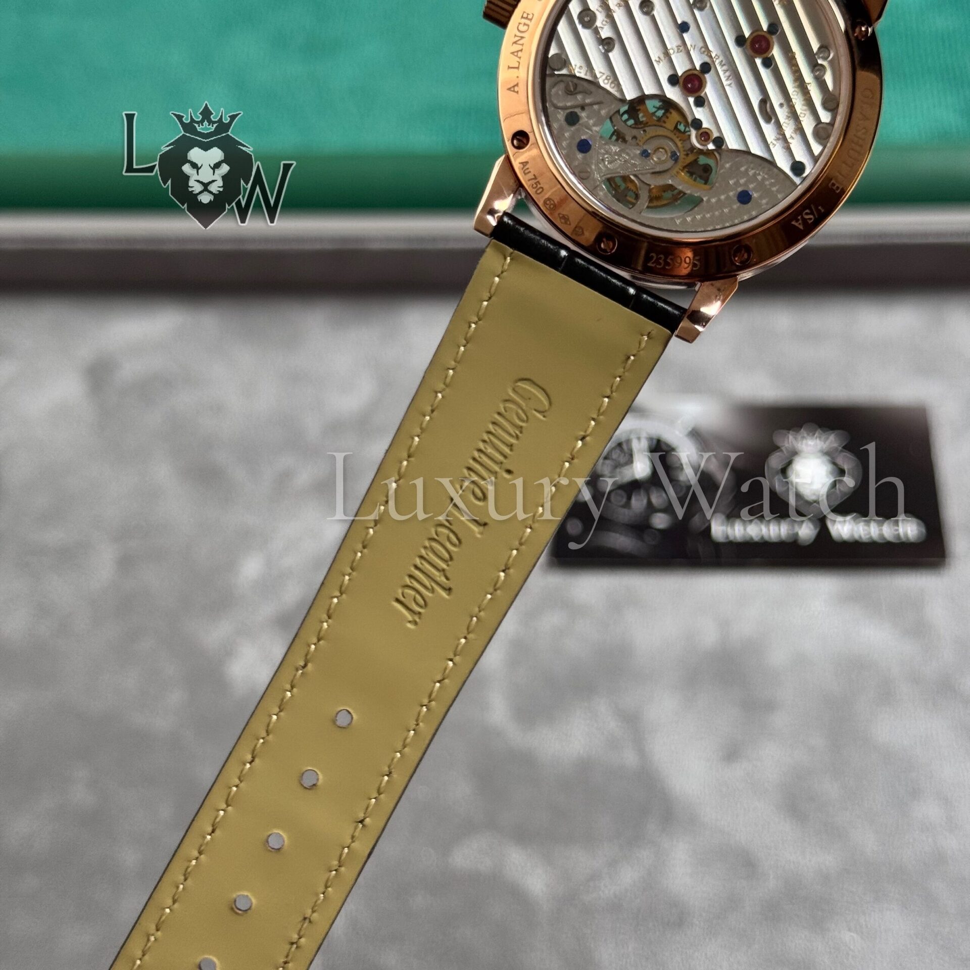 - Часы оснащены калибром L102.1 с ручным заводом, который был разработан и изготовлен в мастерских A. Lange & Sohne.