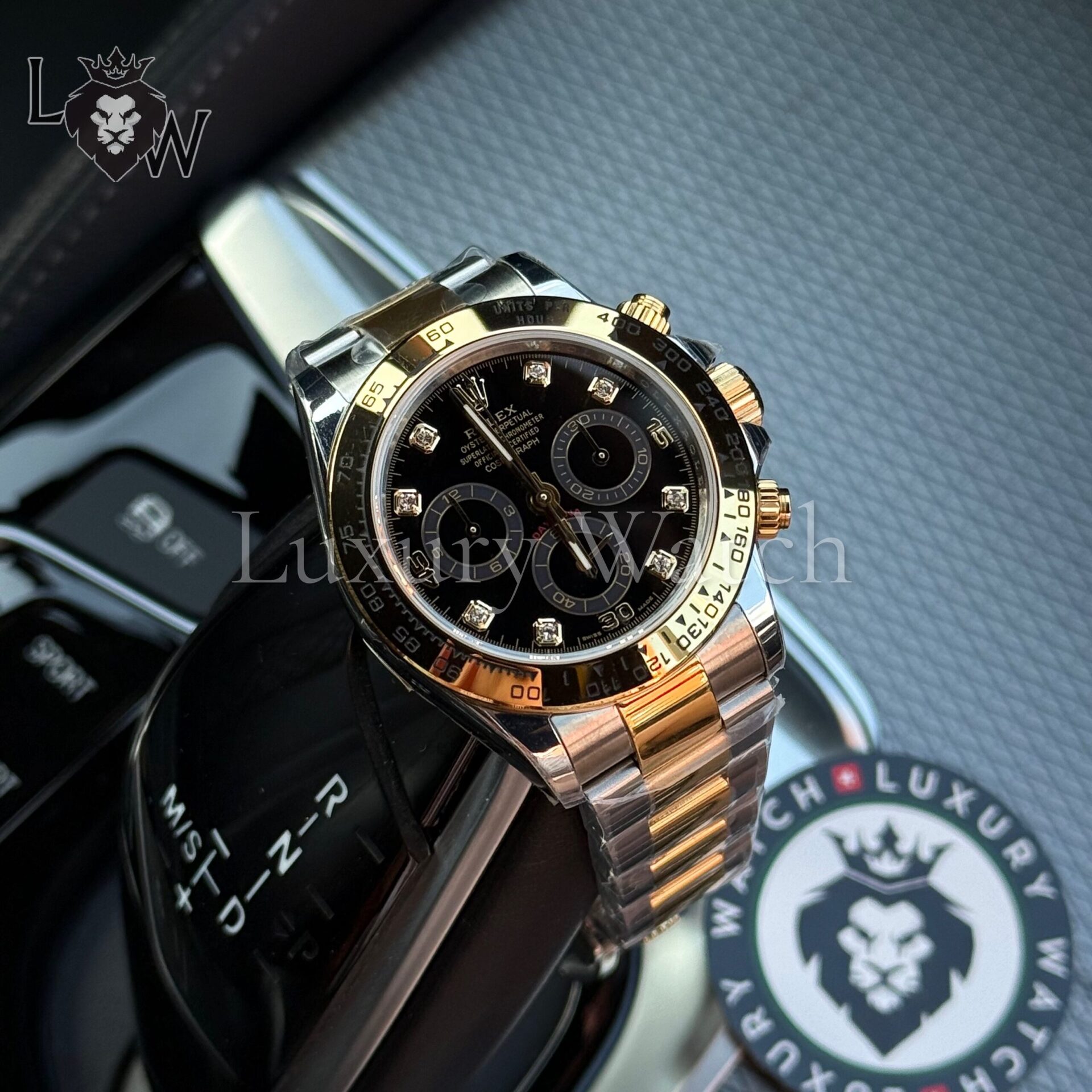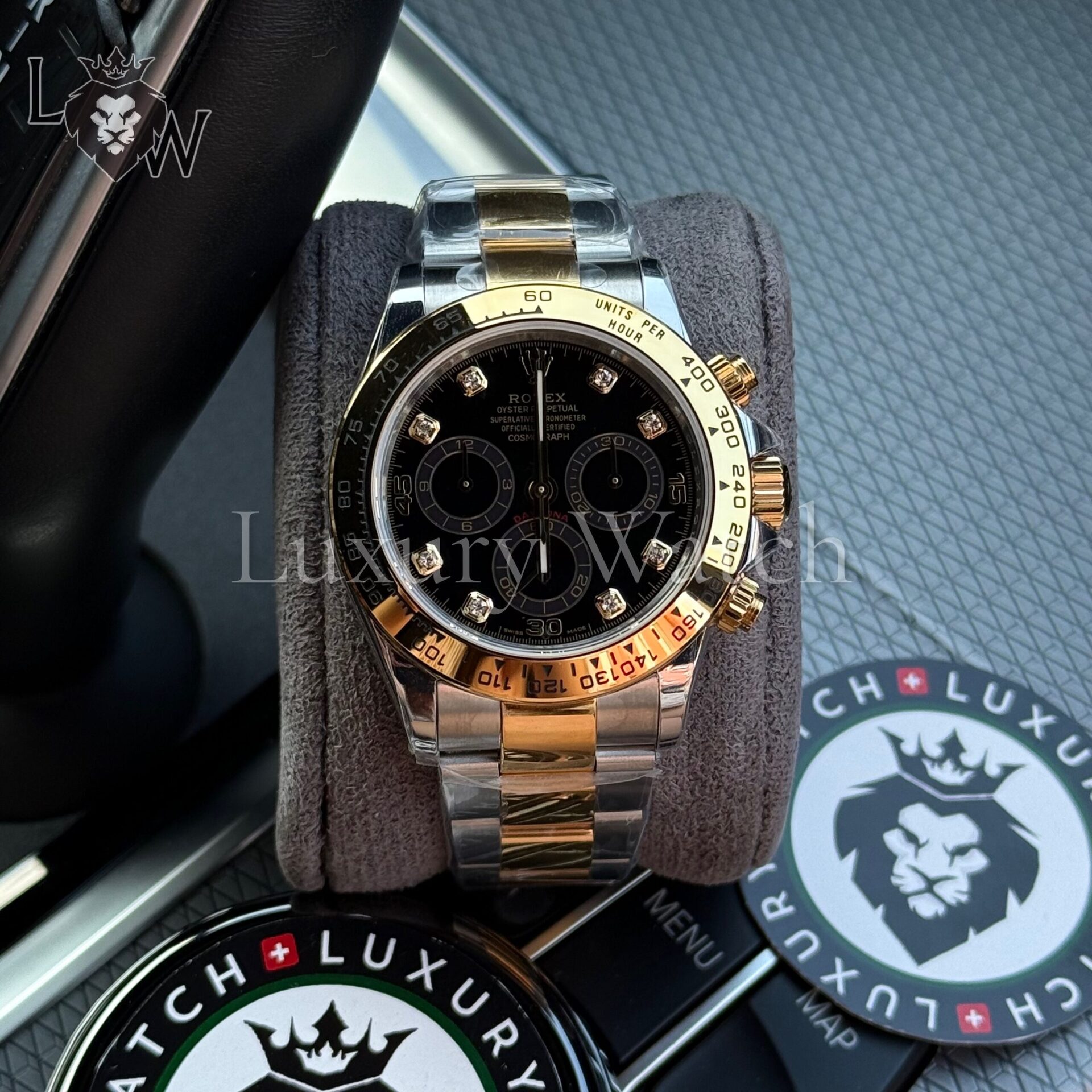 Циферблат часов выполнен в черном цвете с золотыми метками и стрелками, что обеспечивает отличную читаемость в любых условиях. Сапфировое стекло защищает циферблат от царапин и повреждений, а водонепроницаемость до 100 метров позволяет использовать часы даже в экстремальных условиях.