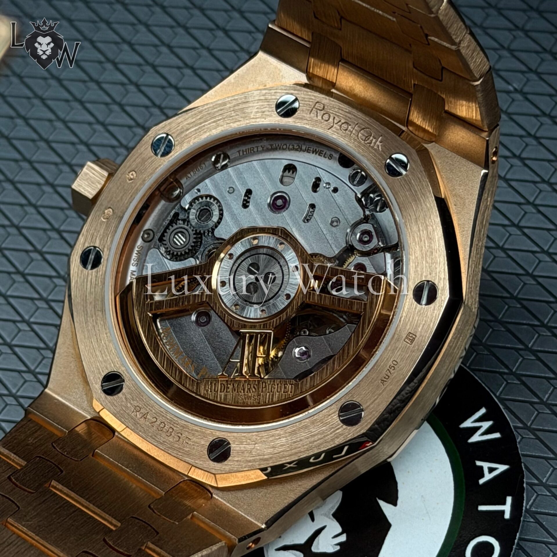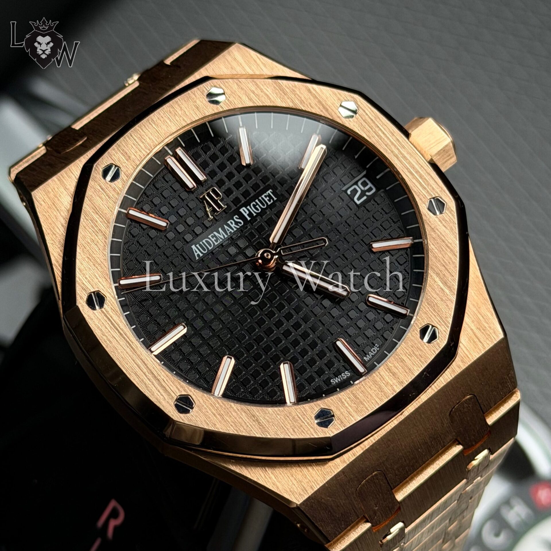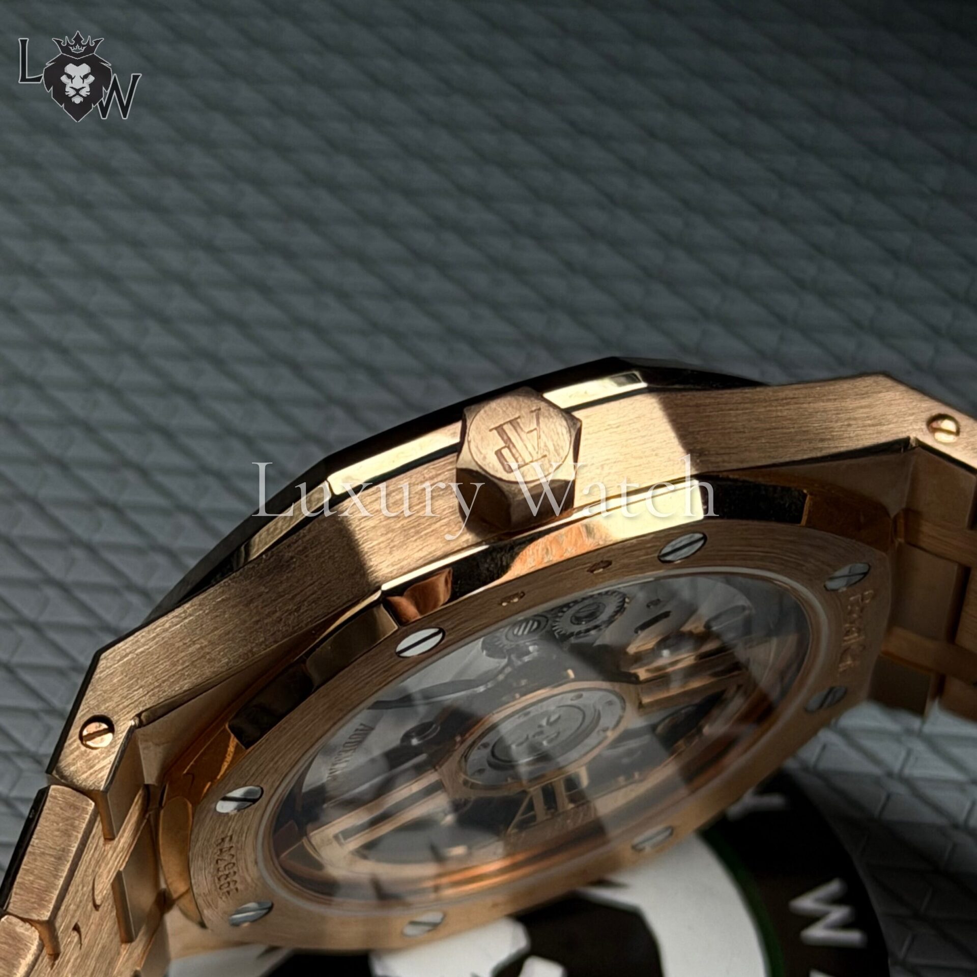 Дизайн часов Royal Oak отличается характерным восьмиугольным безелем с видимыми винтами, что придает им уникальный и узнаваемый облик. Циферблат выполнен в фирменном стиле «Grande Tapisserie» с изысканным узором, который подчеркивает внимание к деталям. Индексы и стрелки из розового золота с люминесцентным покрытием обеспечивают отличную читаемость в любых условиях освещения.
