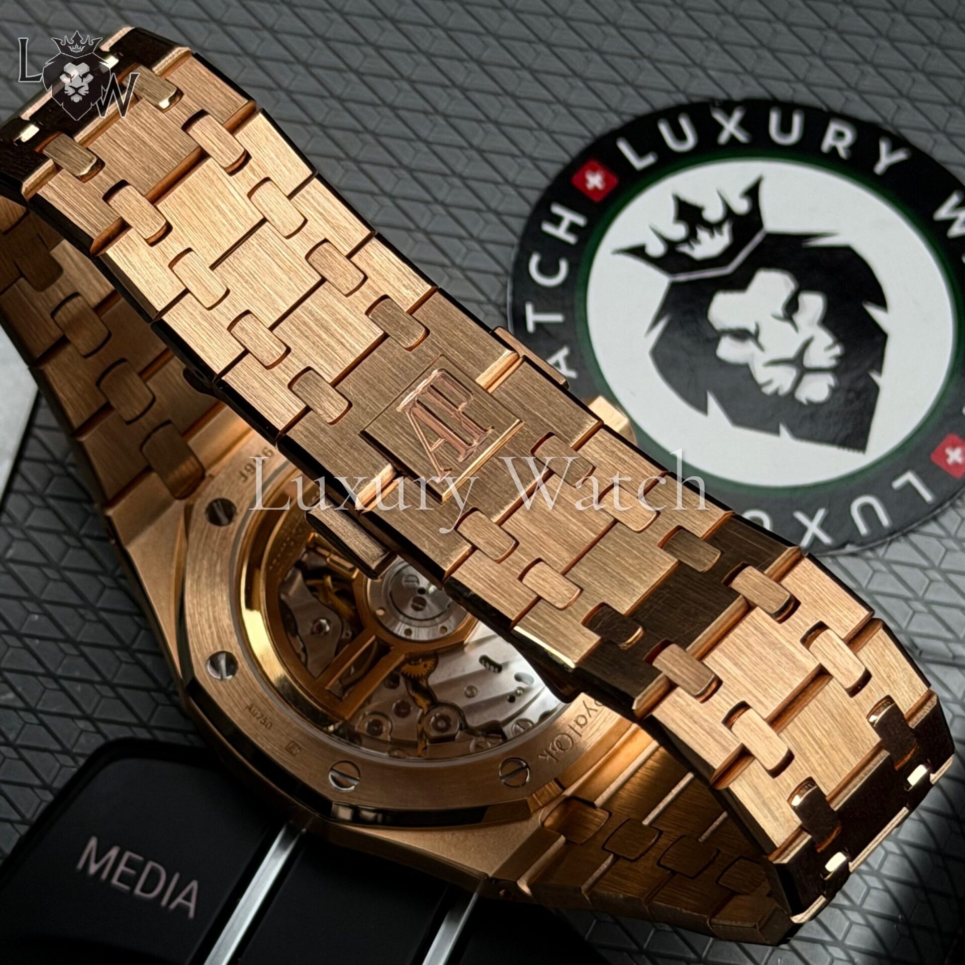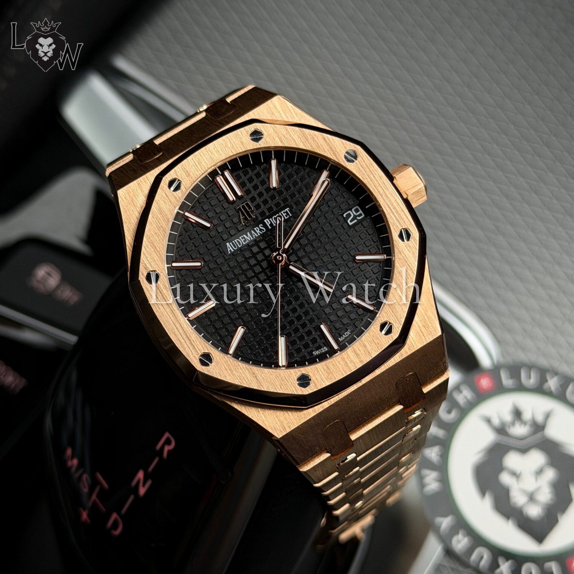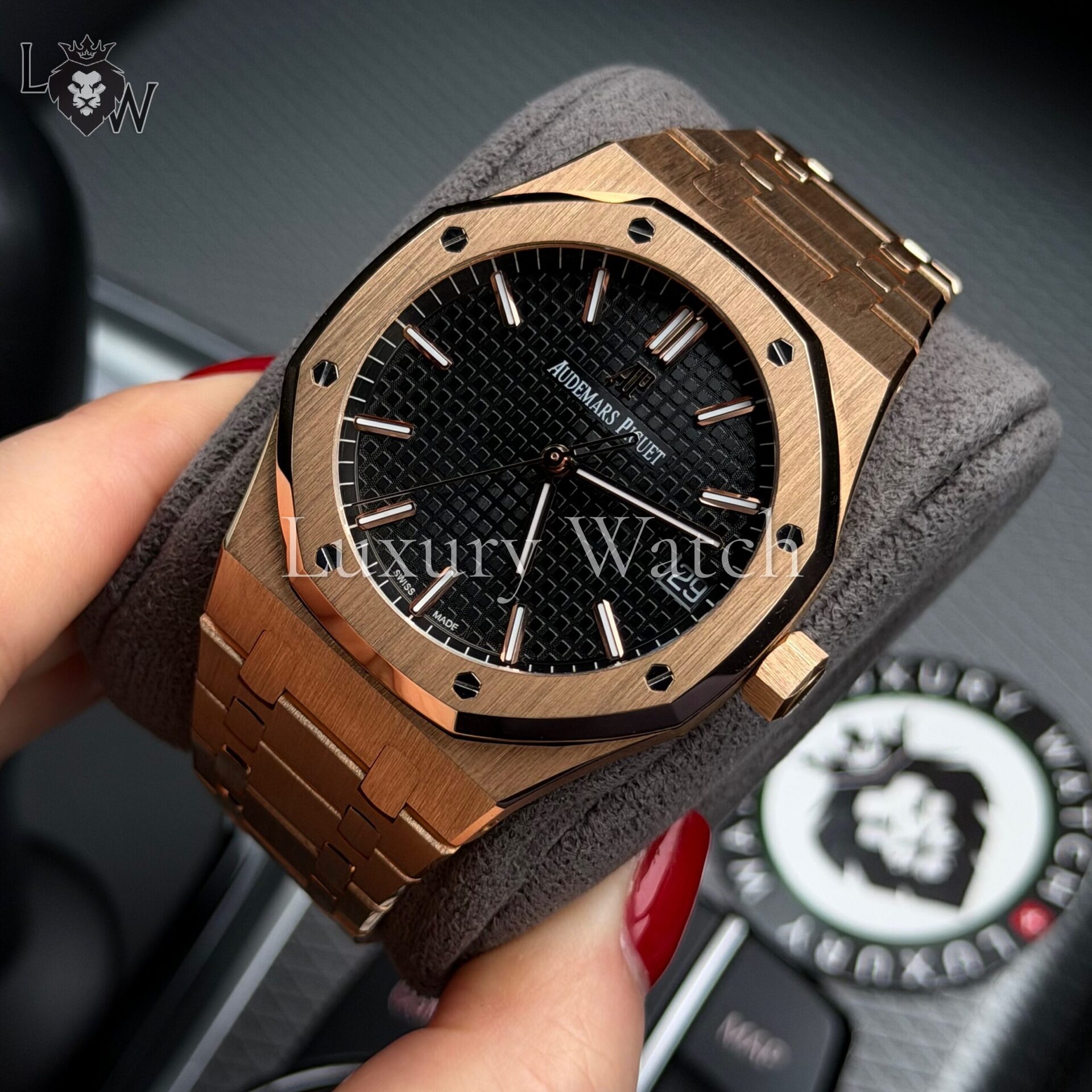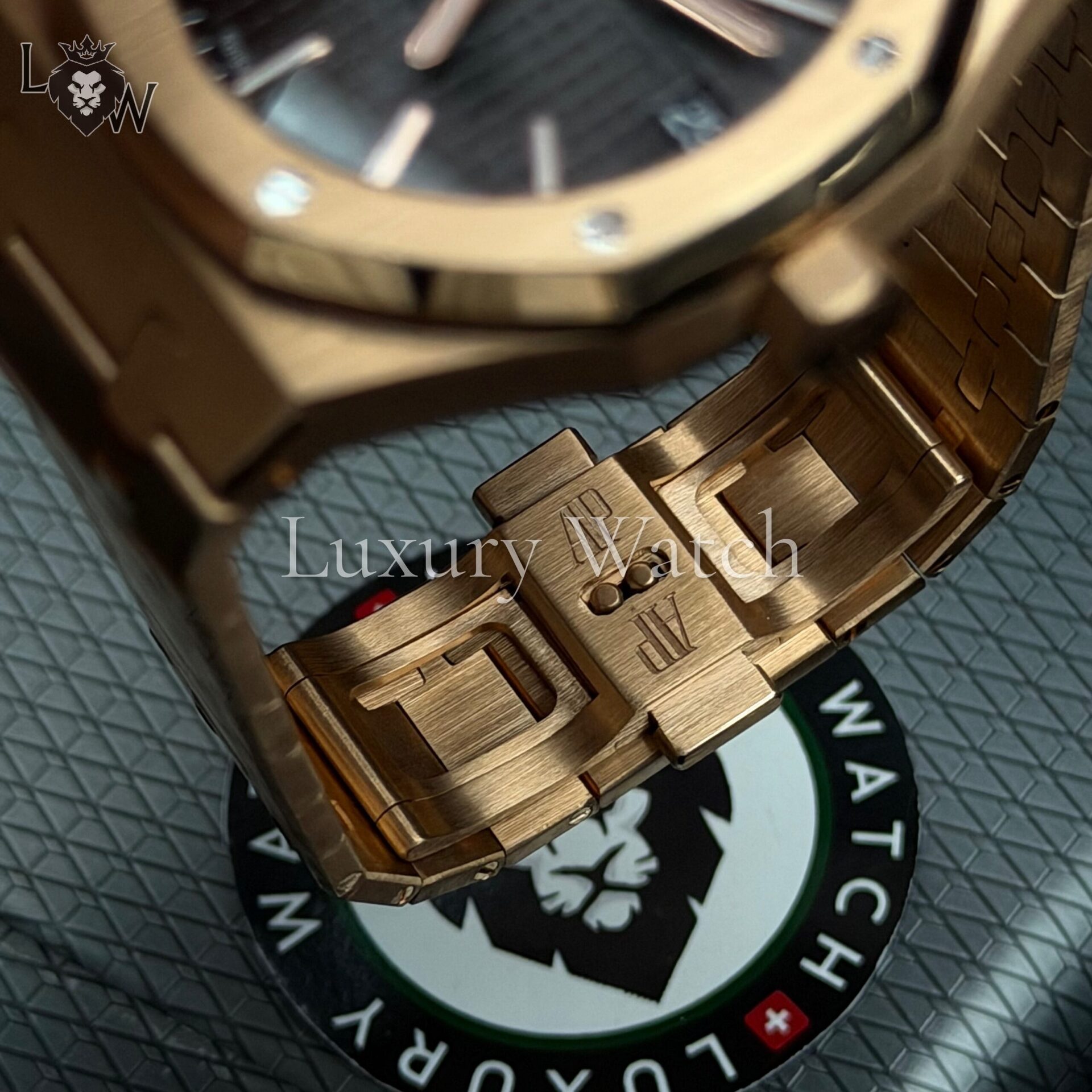 Дизайн часов Royal Oak отличается характерным восьмиугольным безелем с видимыми винтами, что придает им уникальный и узнаваемый облик. Циферблат выполнен в фирменном стиле «Grande Tapisserie» с изысканным узором, который подчеркивает внимание к деталям. Индексы и стрелки из розового золота с люминесцентным покрытием обеспечивают отличную читаемость в любых условиях освещения.