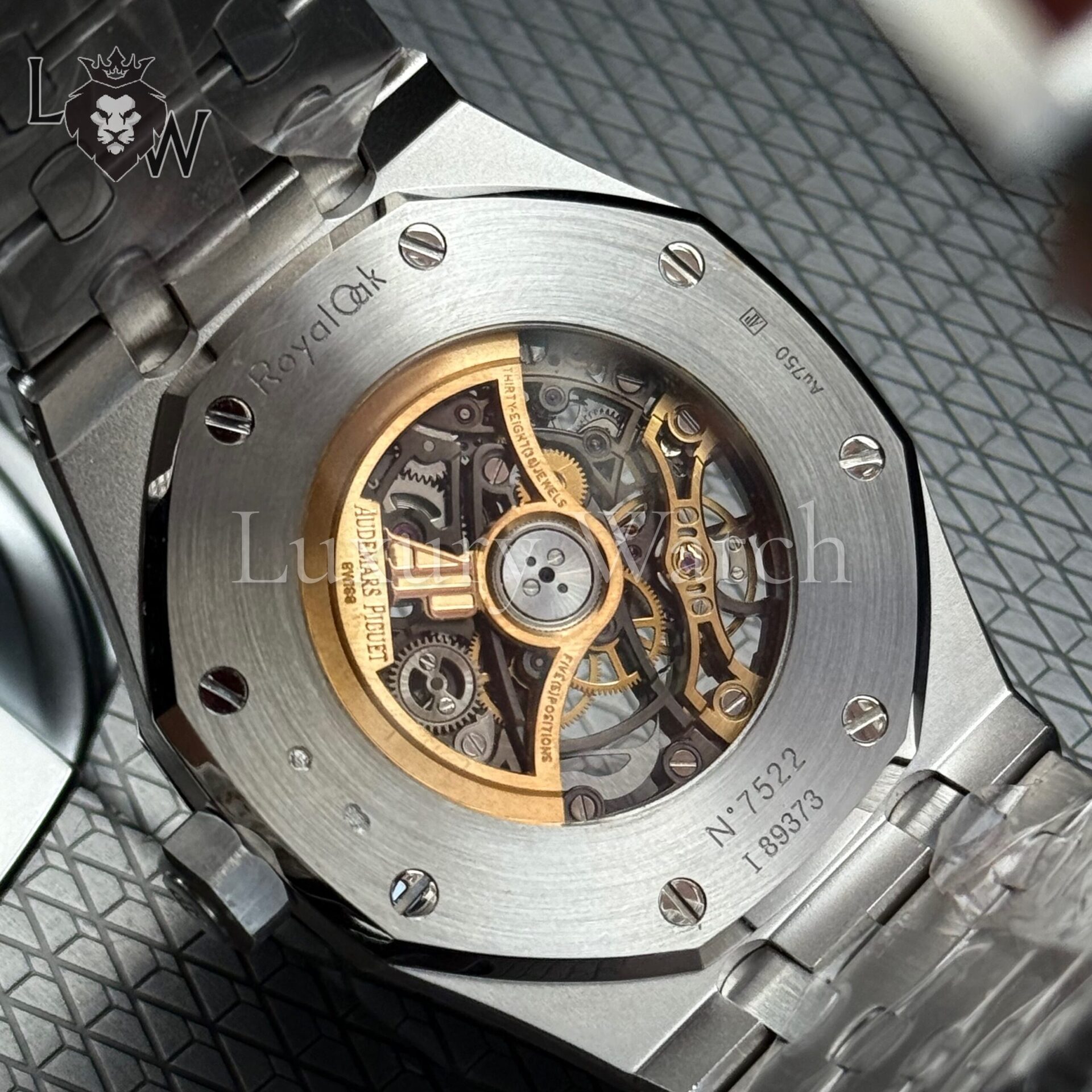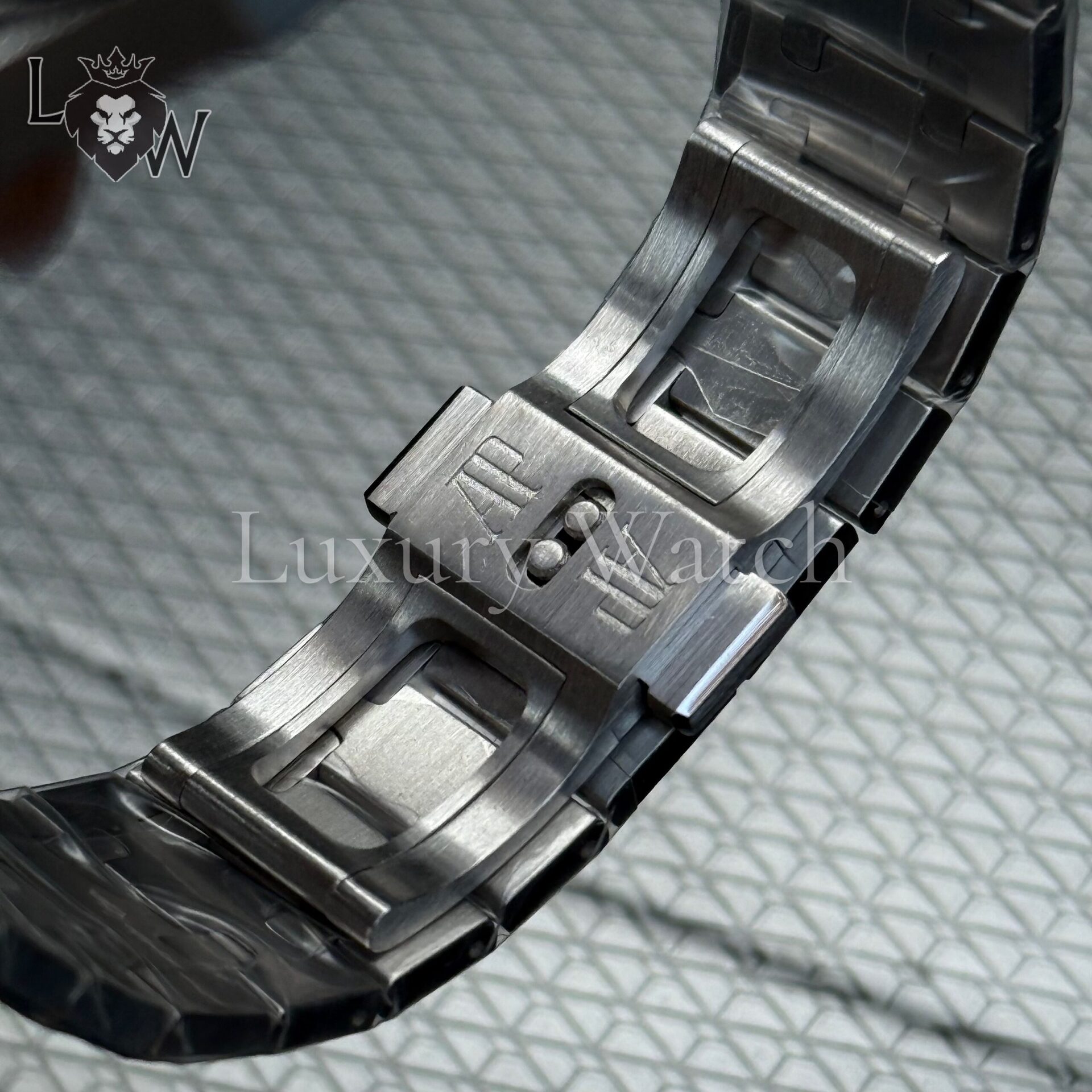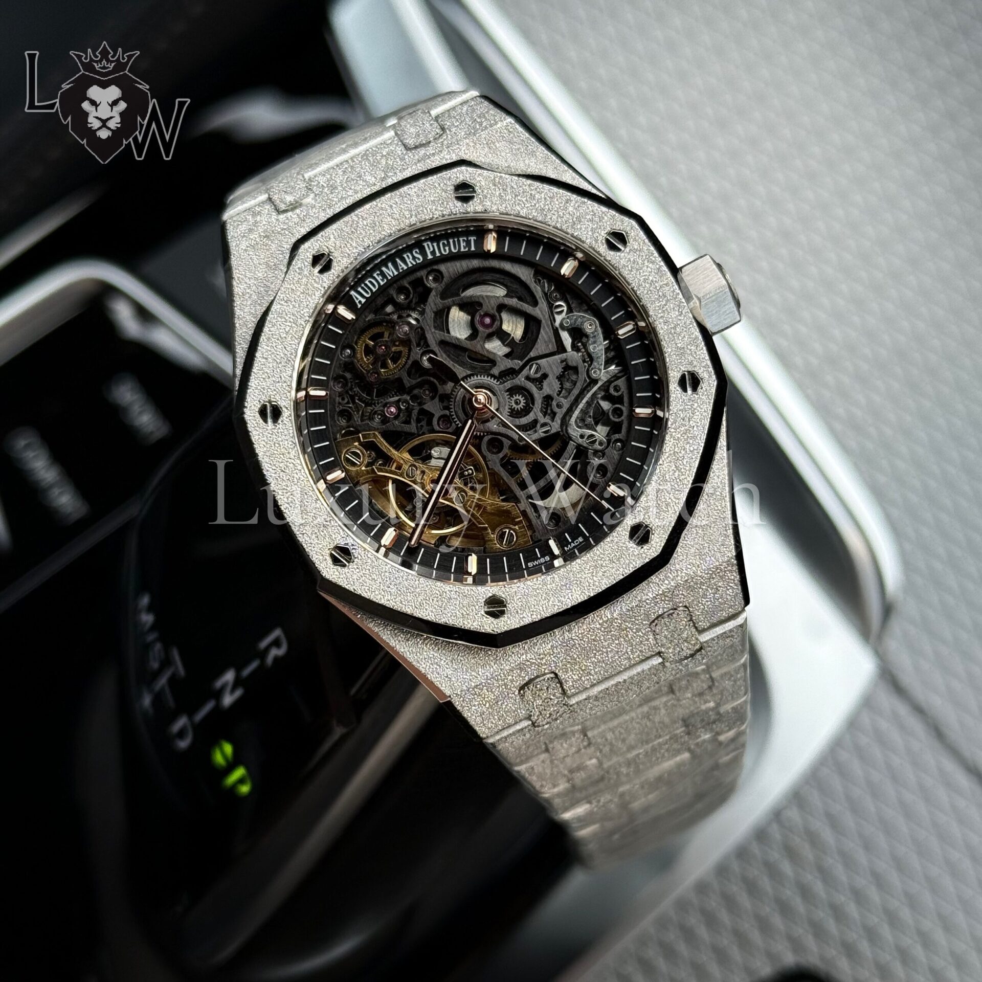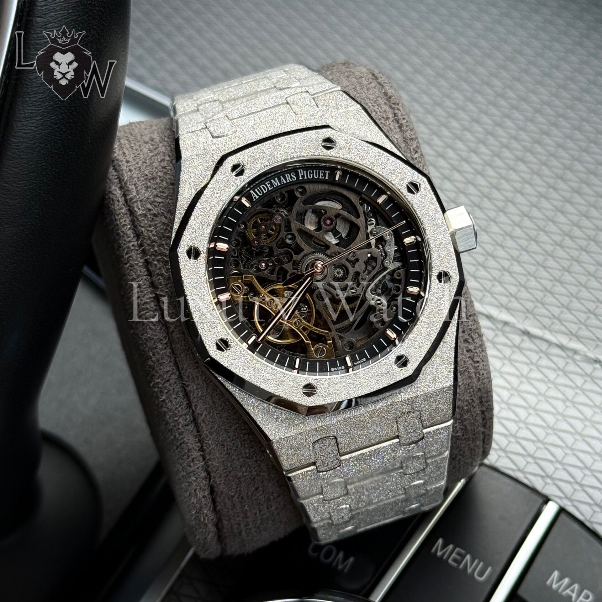 Эти часы выделяются своим уникальным дизайном, который сочетает в себе классические элементы Royal Oak с современными инновациями. Эффект «Frosted Gold» был разработан в сотрудничестве с итальянским ювелиром Каролиной Буццолини и придает часам неповторимый вид, напоминающий о сверкающем бриллиантовом покрытии.